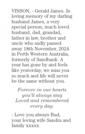 Always remembered and missed dearly. James, a wonderful Father, Father in law, Grandad and Husband to Sandra. We will love and miss you forever.